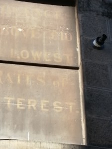 The main sign seems to indicate it was at one stage in its existence glaziers and joiners. More mysterious is the wall to the side door, where, at eye level, various numbers and letters are carved into the soft, buttery sandstone – Edwardian hieroglyphics of some kind. If I were a conspiracy theorist I’d say it was Masonic, but there’s probably a more prosaic explanation.