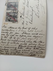 It goes on: ‘Here is the last of this collection! I have still 3 pretty cards for you. Please send on, one by one as before, one dozen of the H. @ 8/- per dozen to be paid as explained, also the other pair of  white silk gloves. Trust all are well. Shall write again on receiving letter. Had letter from Watson asking about mamma. Has she written to him yet? Much dear love to all from Ally. 9.9.12.’